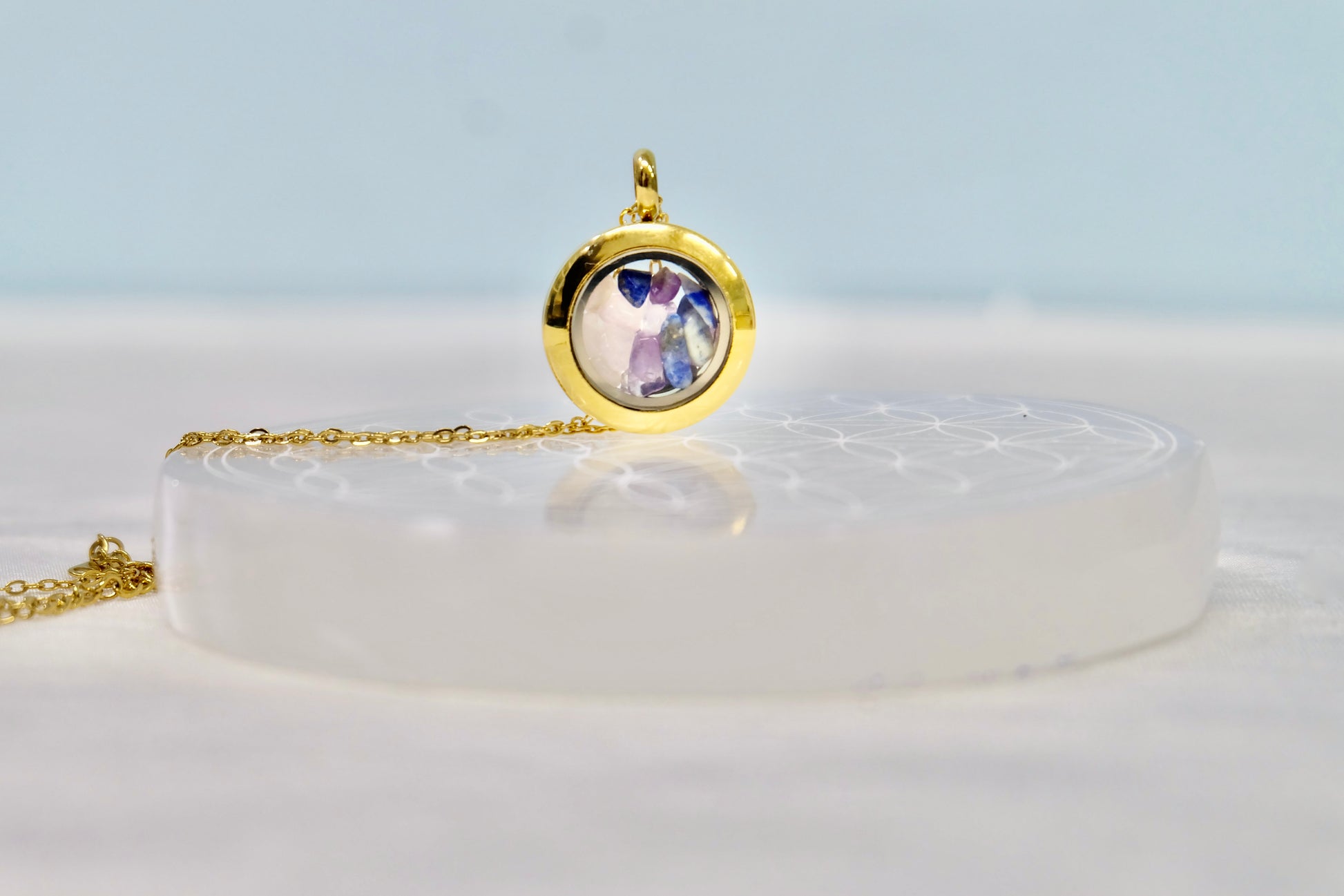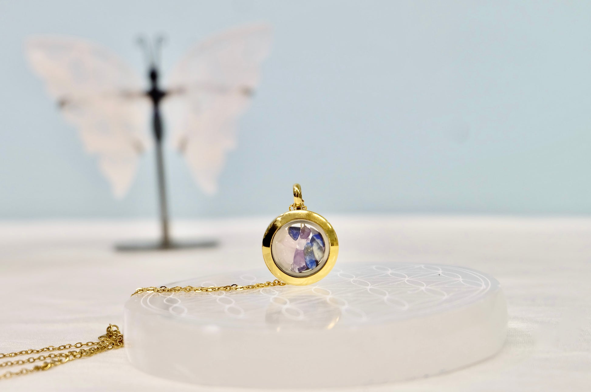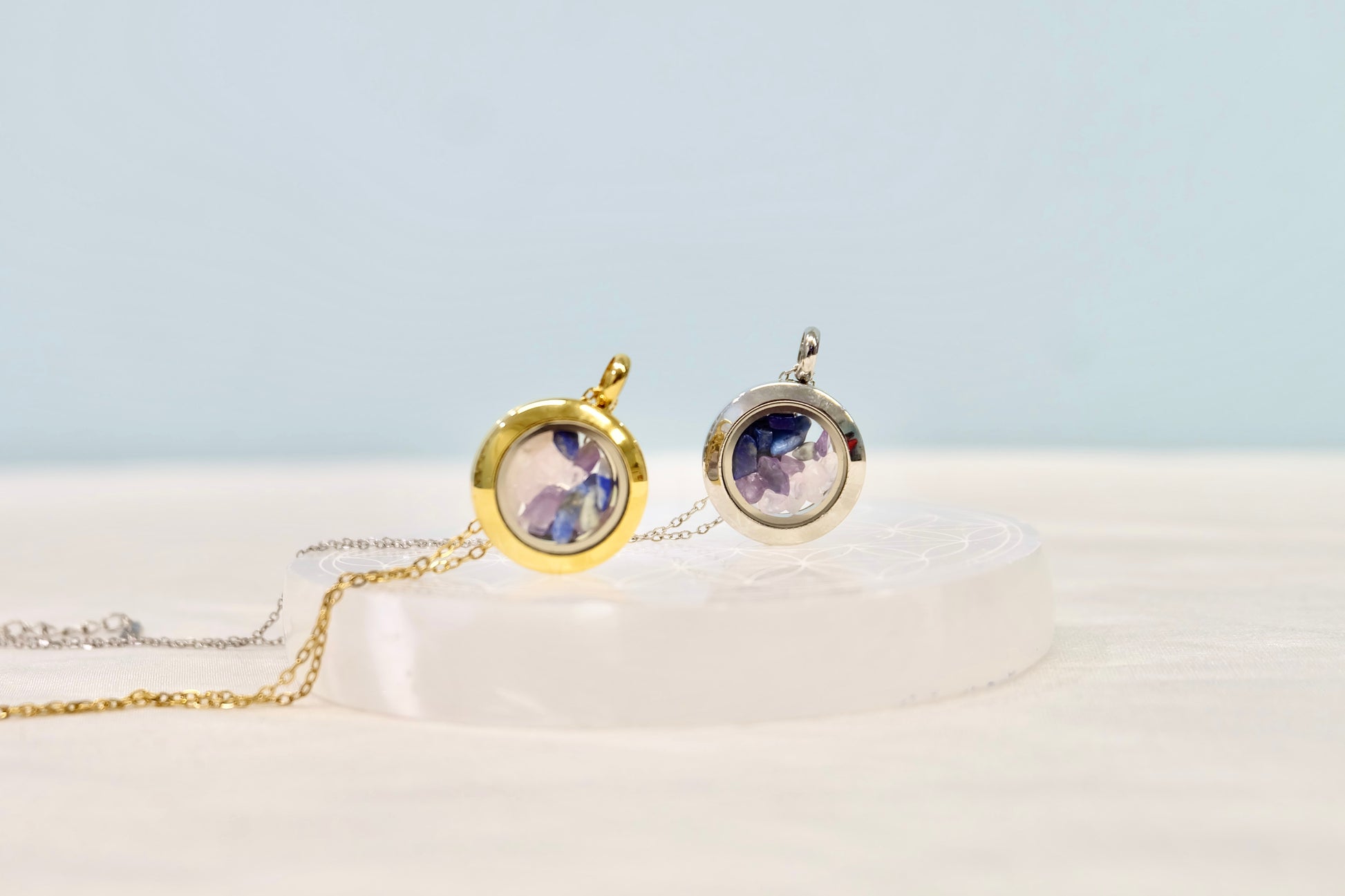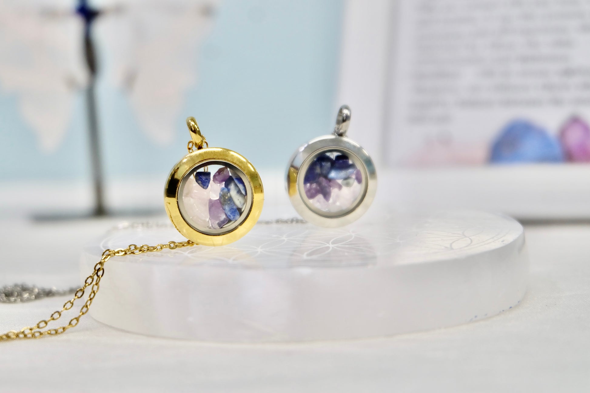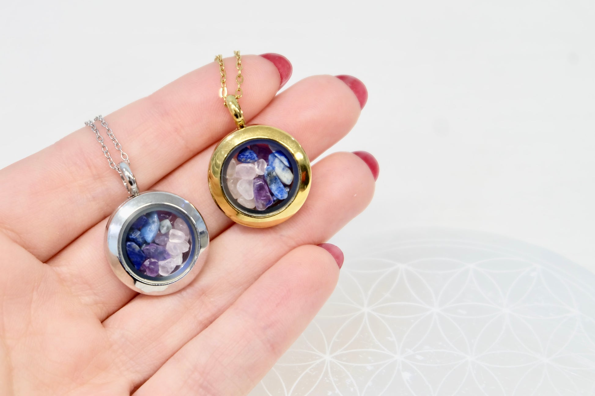 ✨ Zalepljen medaljon – Kristali ostanejo varno zaprti, lahko pa ga na željo pustimo odlepljenega (pustite opombo ob naročilu).
