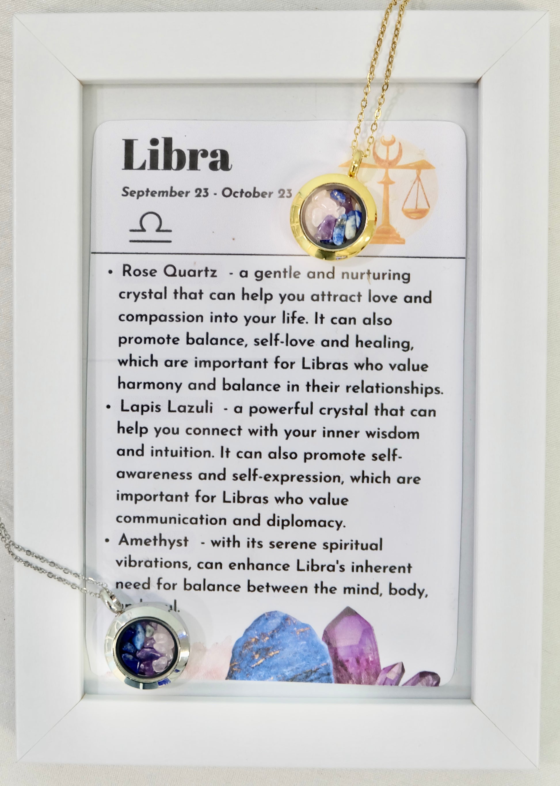 Jeklena verižica s steklenim medaljončkom, napolnjenim s kristali za horoskopski/zodiak znak Tehtnica