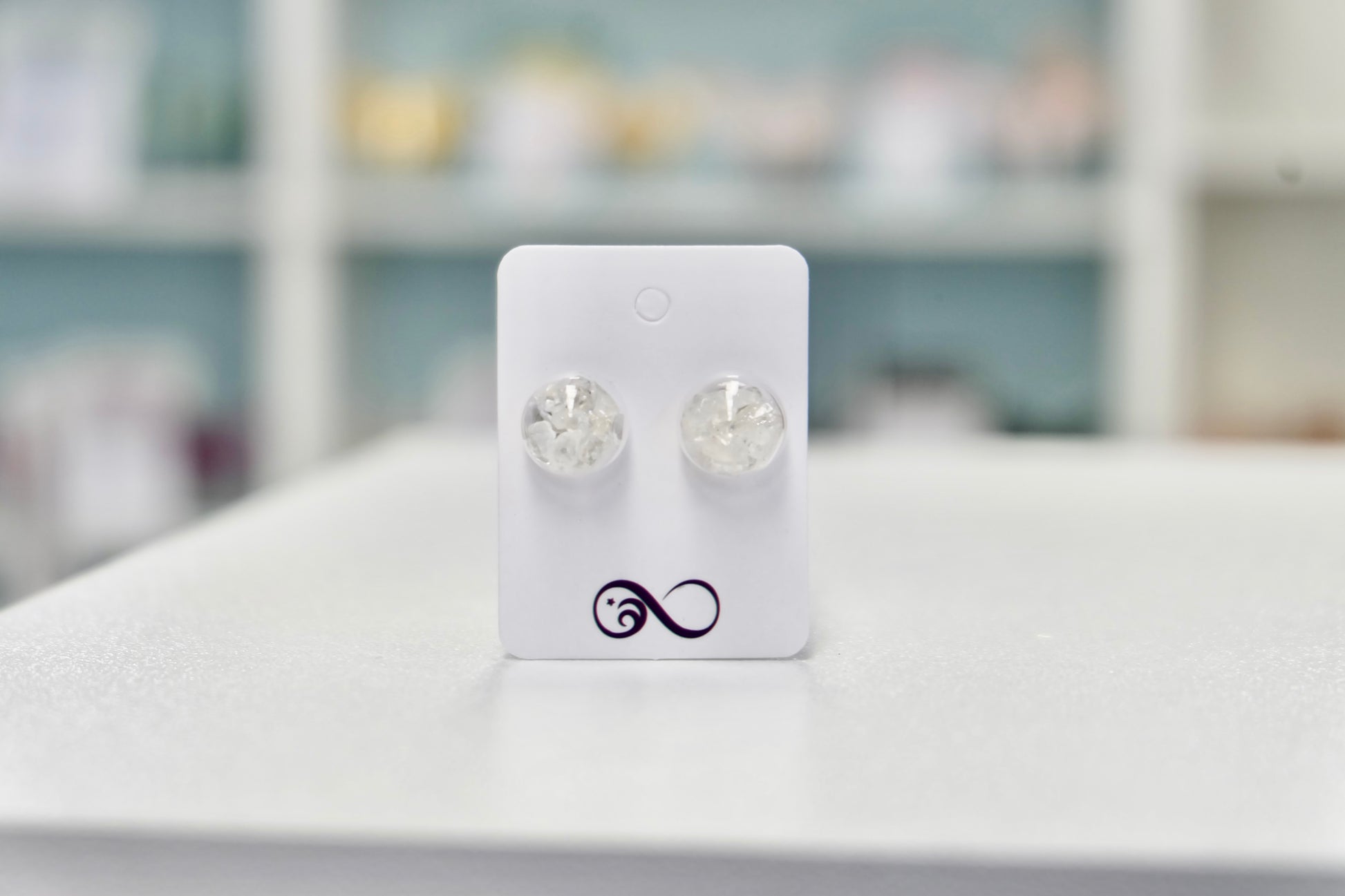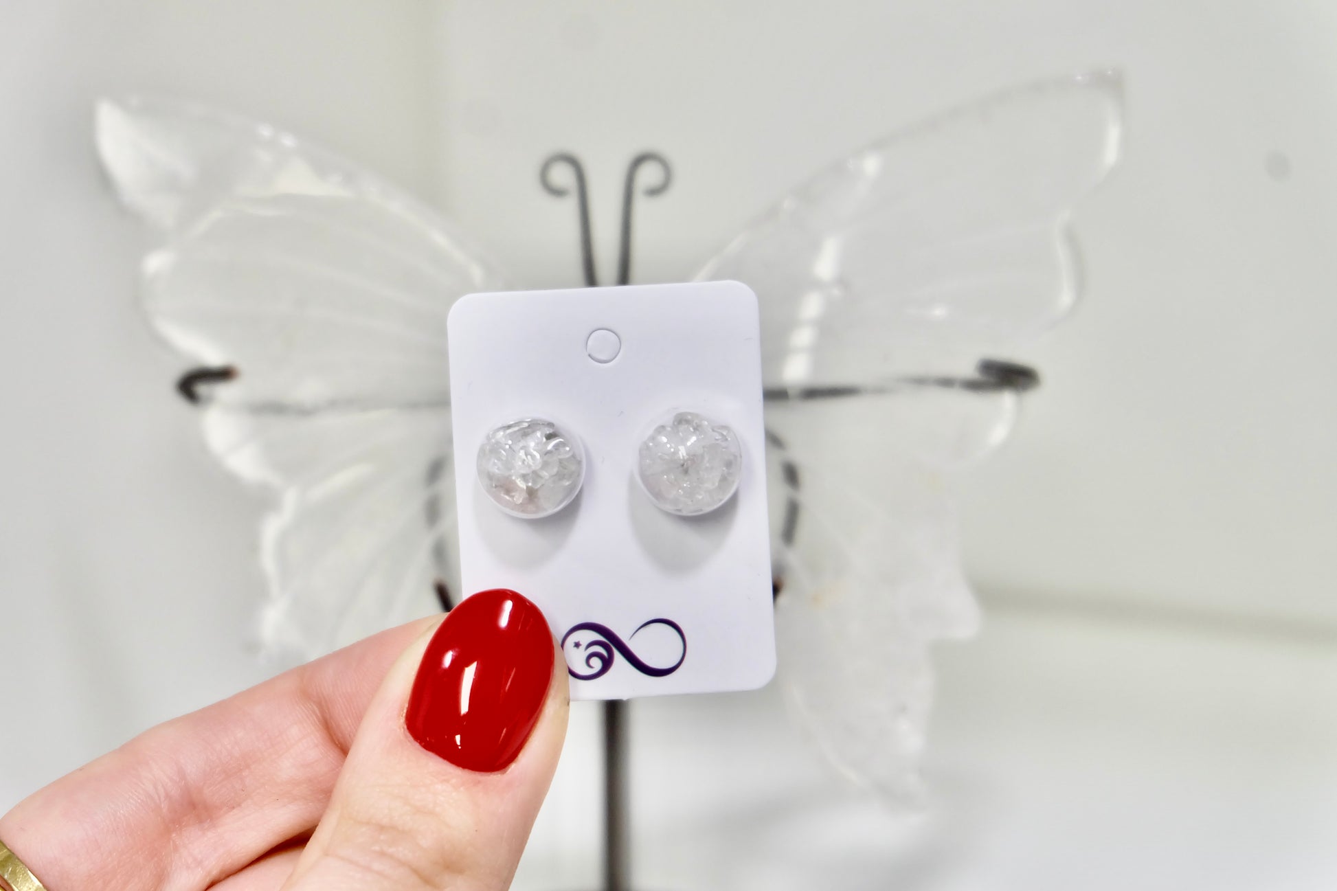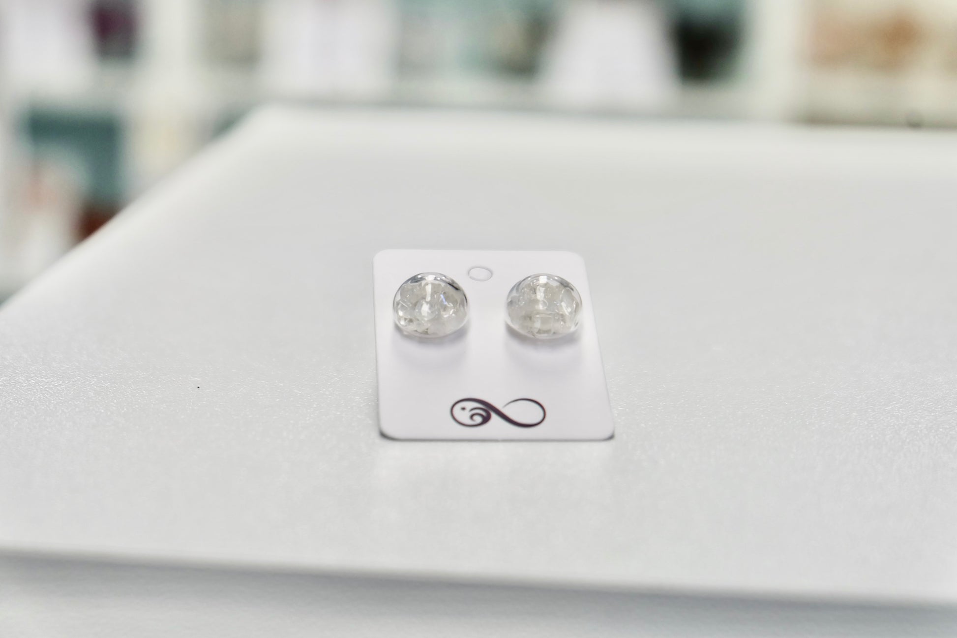 Uhani so sestavljeni iz majhnih steklenih bunkic, ki jih skrbno napolnim z drobnimi koščki kamene strele. Ker so bunkice ročno pihano steklo, je vsak par nekoliko edinstven, z majhnimi odstopanji ali drobnimi nepravilnostmi, ki jim dajejo njihov poseben čar.