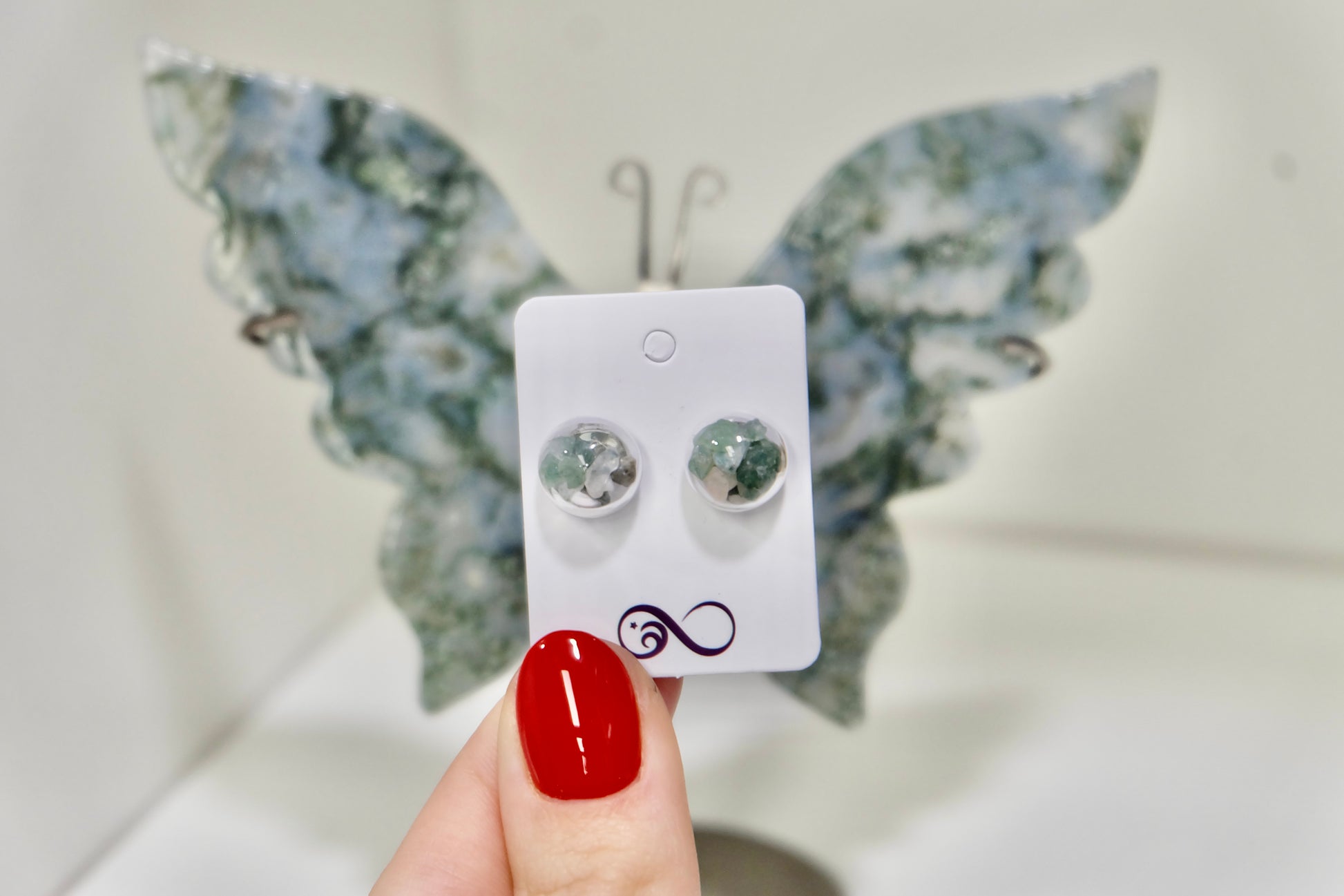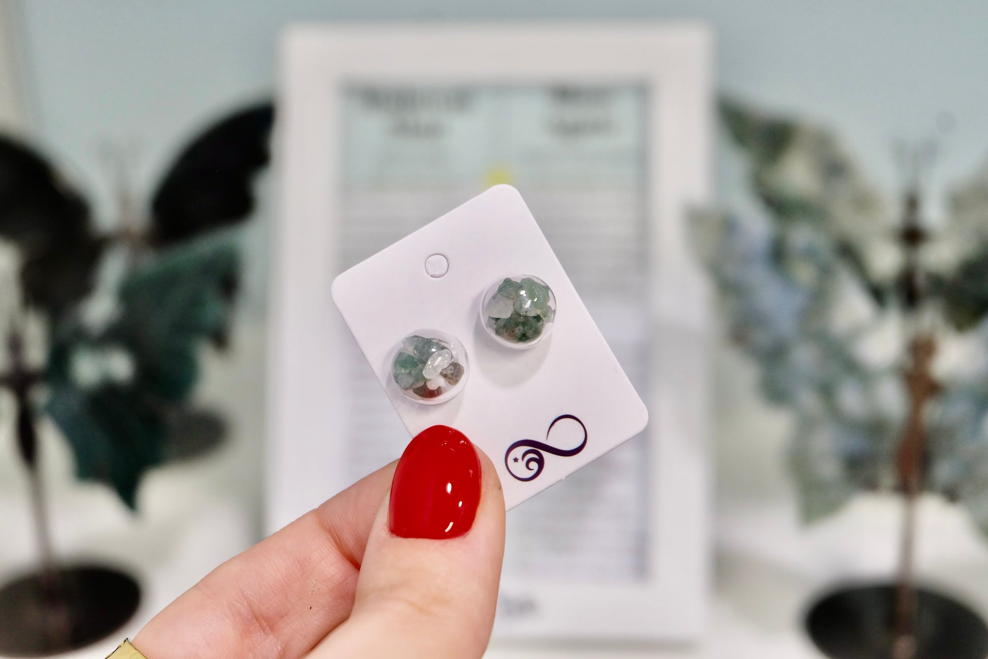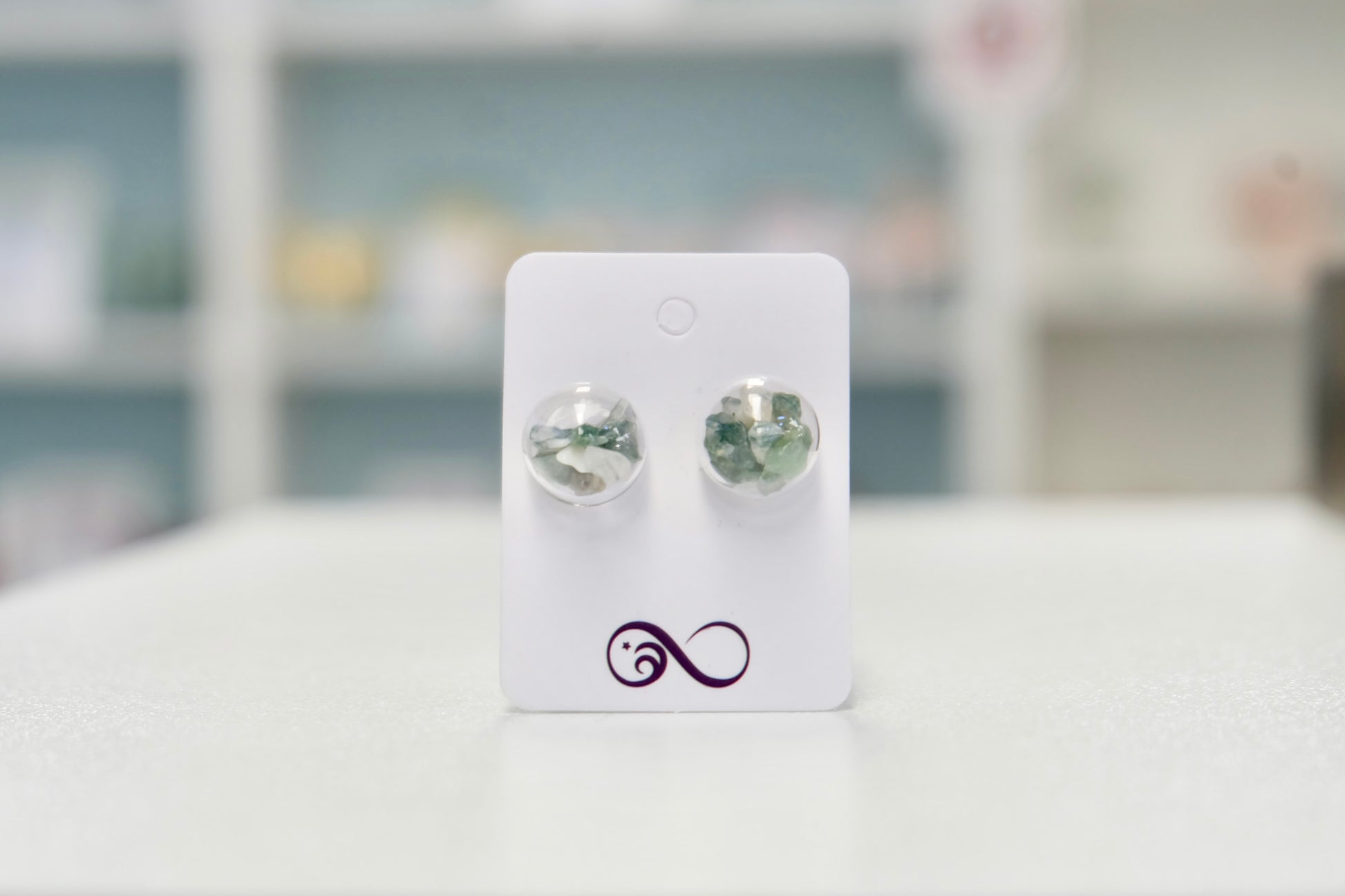 Uhani so sestavljeni iz majhnih steklenih bunkic, ki jih skrbno napolnim z drobnimi koščki mahovnega ahata. Ker so bunkice ročno pihano steklo, je vsak par nekoliko edinstven, z majhnimi odstopanji ali drobnimi nepravilnostmi, ki jim dajejo njihov poseben čar.