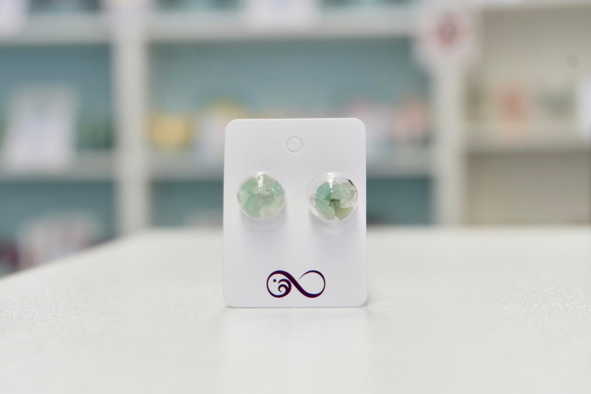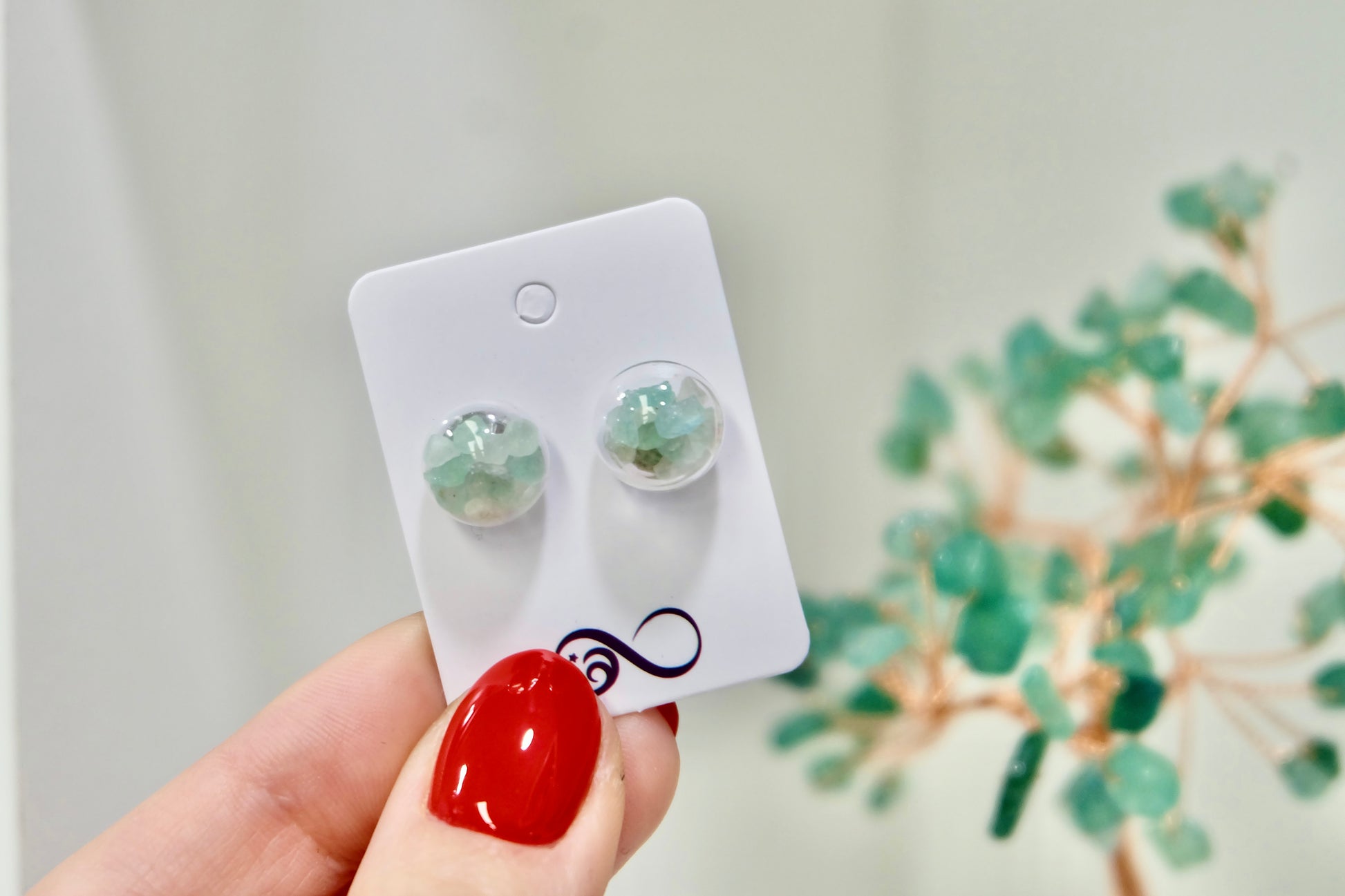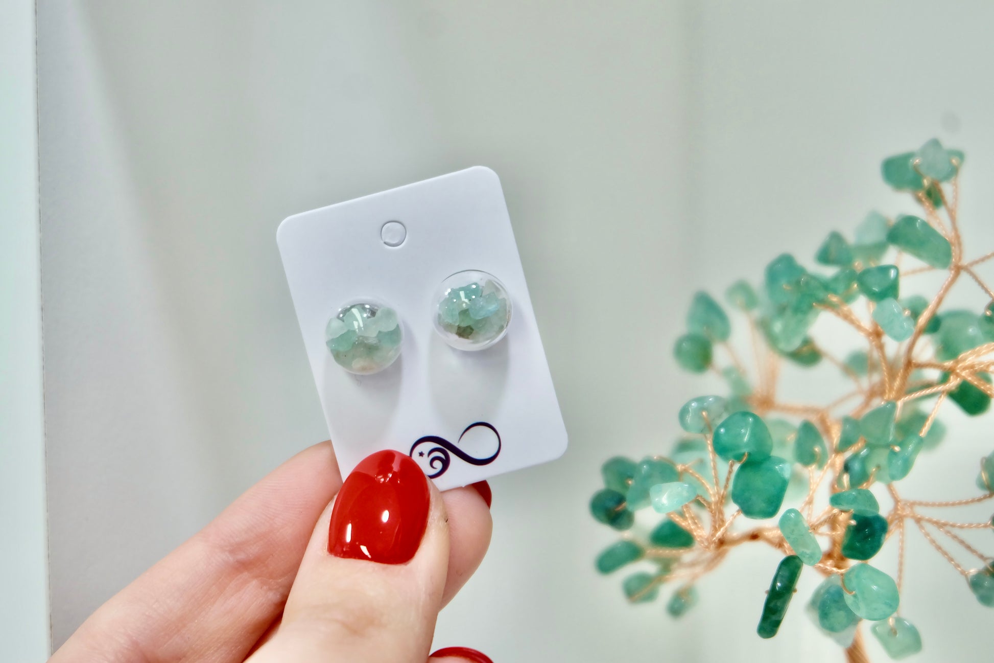 Uhani so narejeni po naročilu in vsak par bo videti nekoliko drugače zaradi naravnih variacij barv in oblik kristalov. Drobni kristalčki v bunkicah se med nošenjem tudi nežno premikajo.