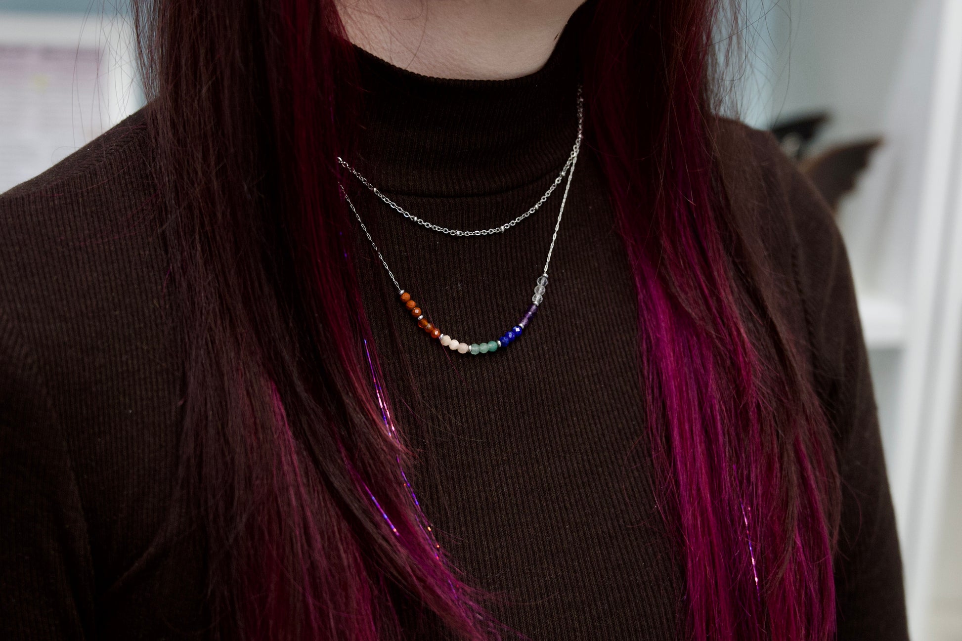 Edinstven dizajn združuje dve ogrlici v eno. Eno nežno ogrlico z dragimi kamni ter krajšo verižico, okrašeno z diskretnimi kroglicami iz nerjavečega jekla.