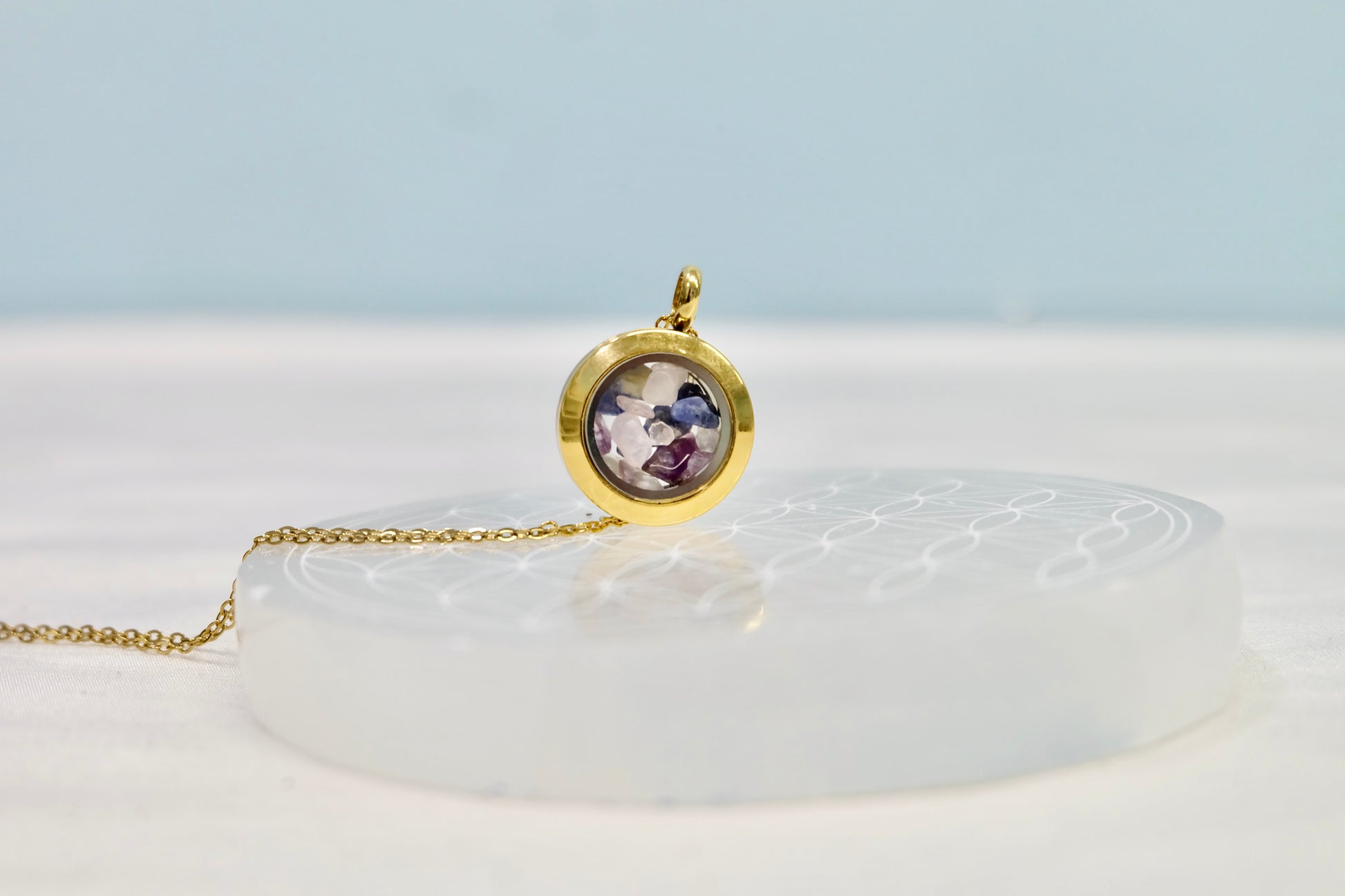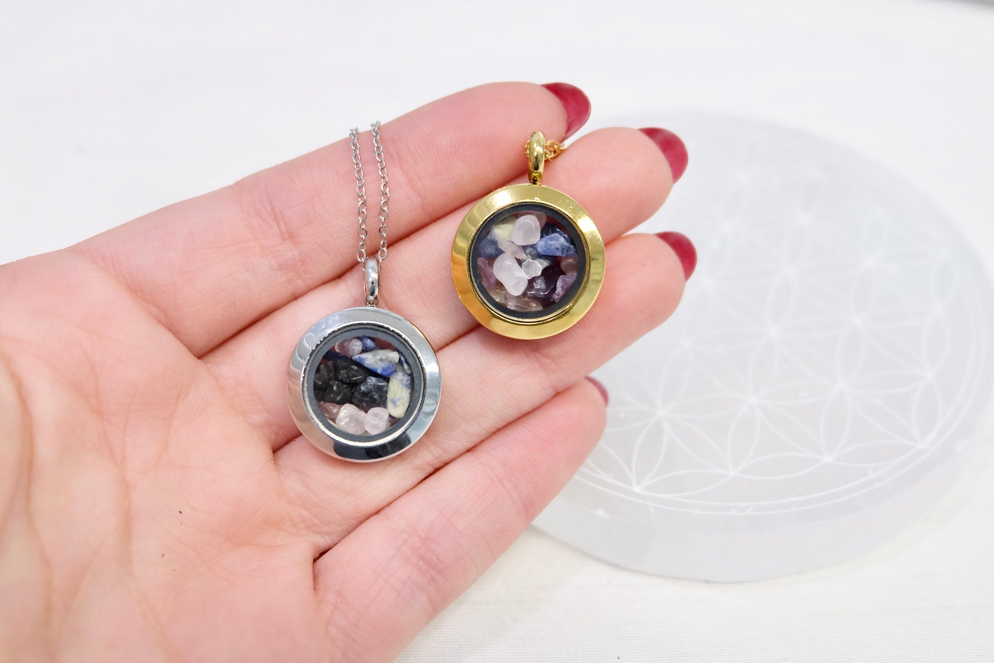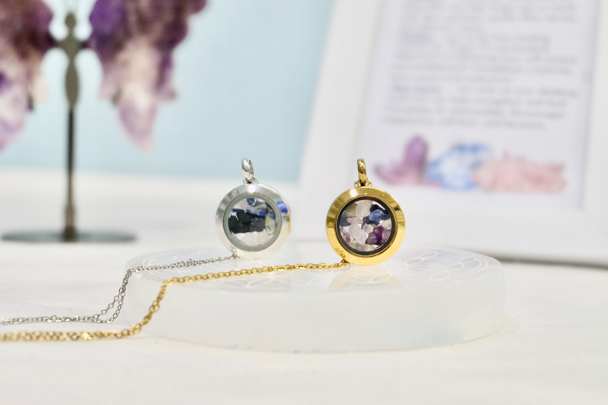 ✨ Zalepljen medaljon – Kristali ostanejo varno zaprti, lahko pa ga na željo pustimo odlepljenega (pustite opombo ob naročilu).
