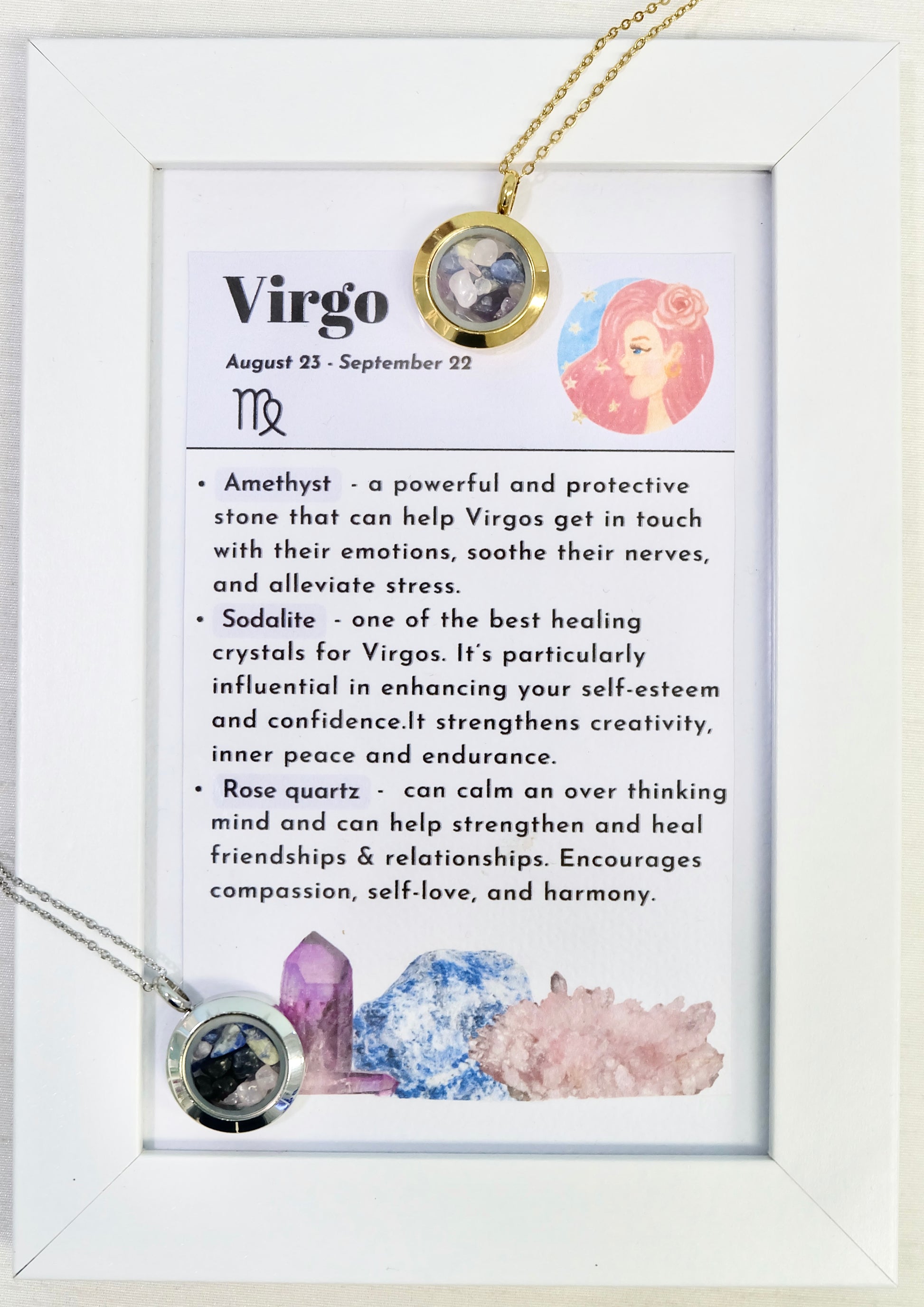 Jeklena verižica s steklenim medaljončkom, napolnjenim s kristali za horoskopski/zodiak znak Devica