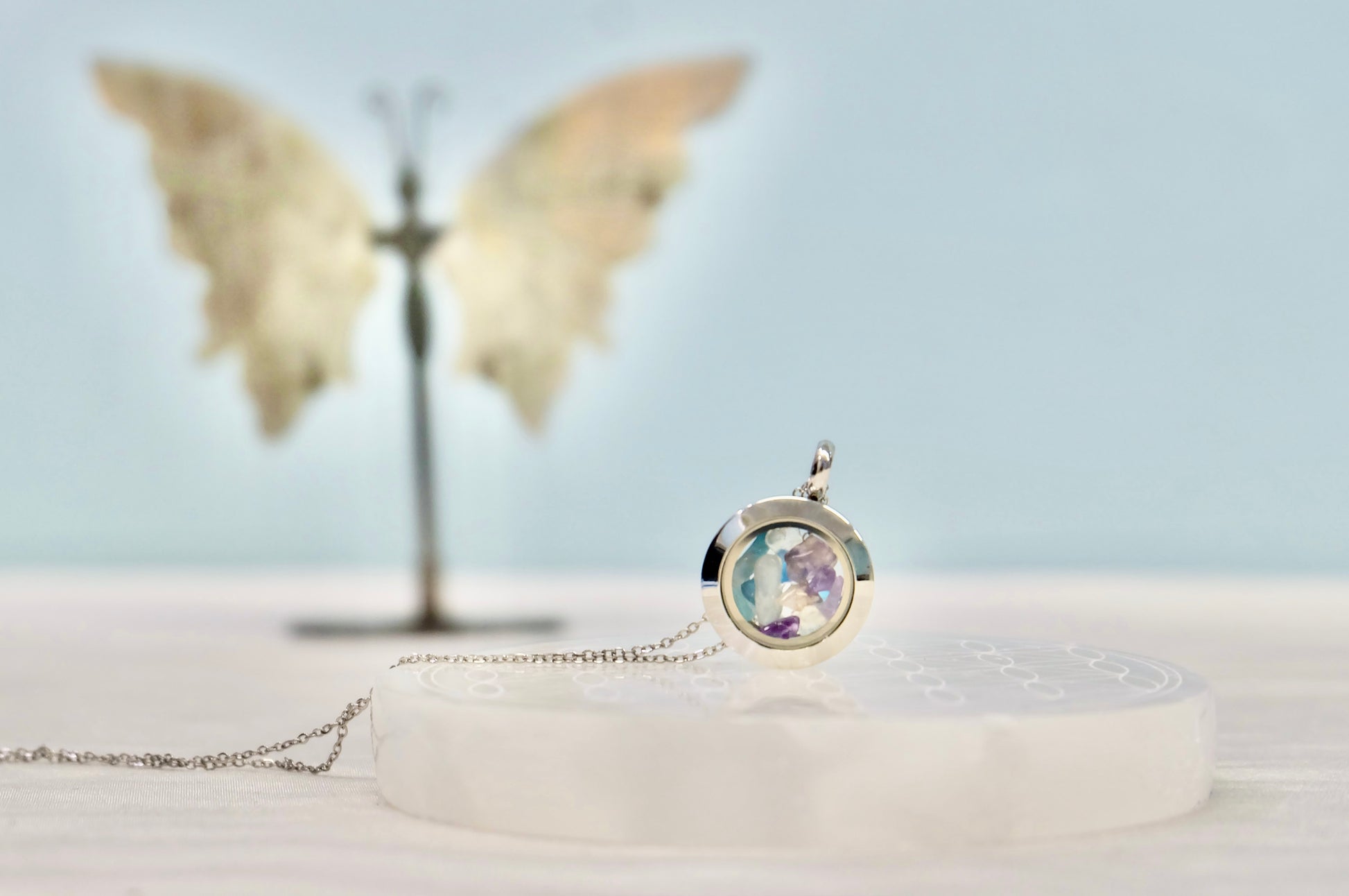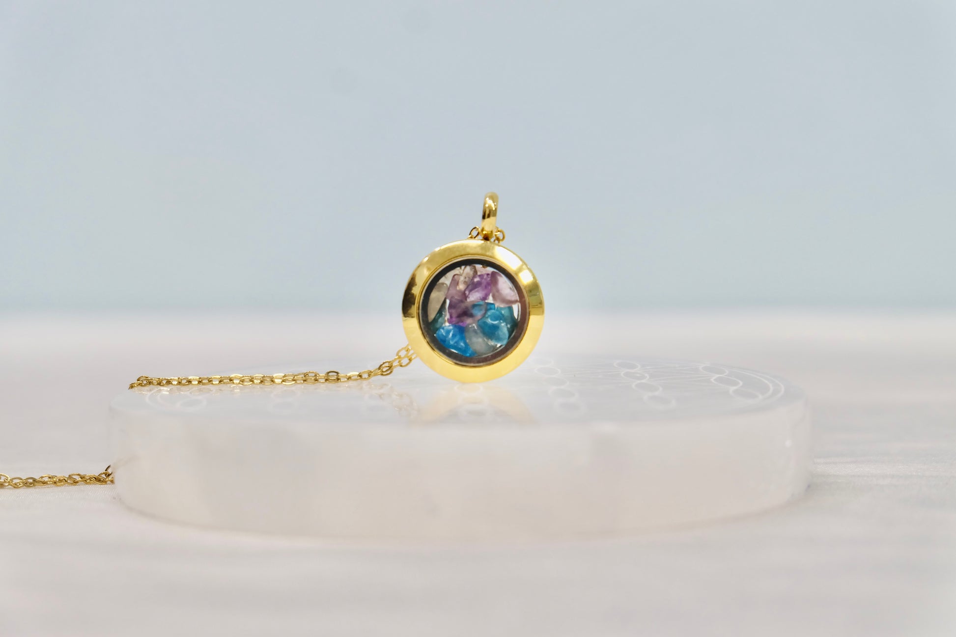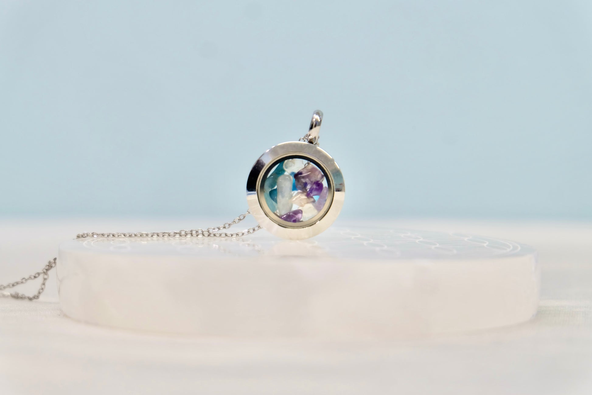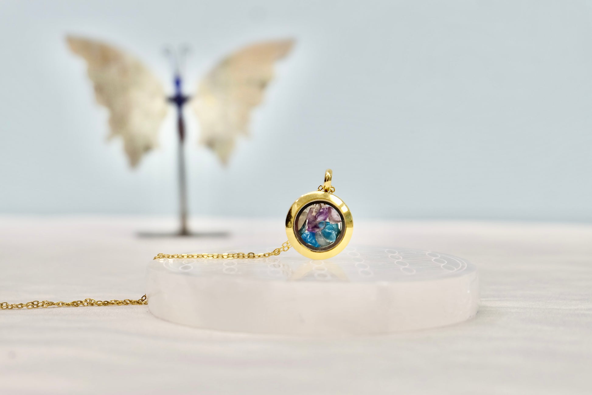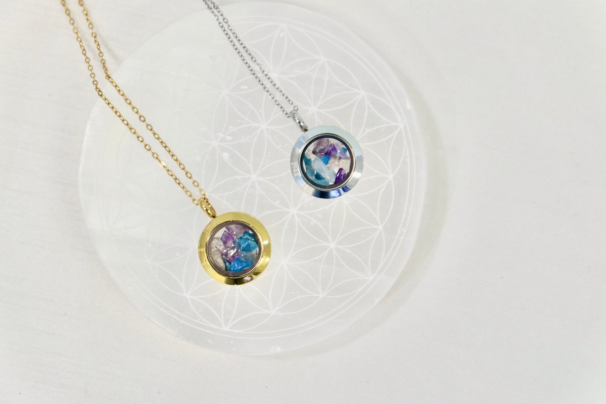 ✨ Zalepljen medaljon – Kristali ostanejo varno zaprti, lahko pa ga na željo pustimo odlepljenega (pustite opombo ob naročilu).