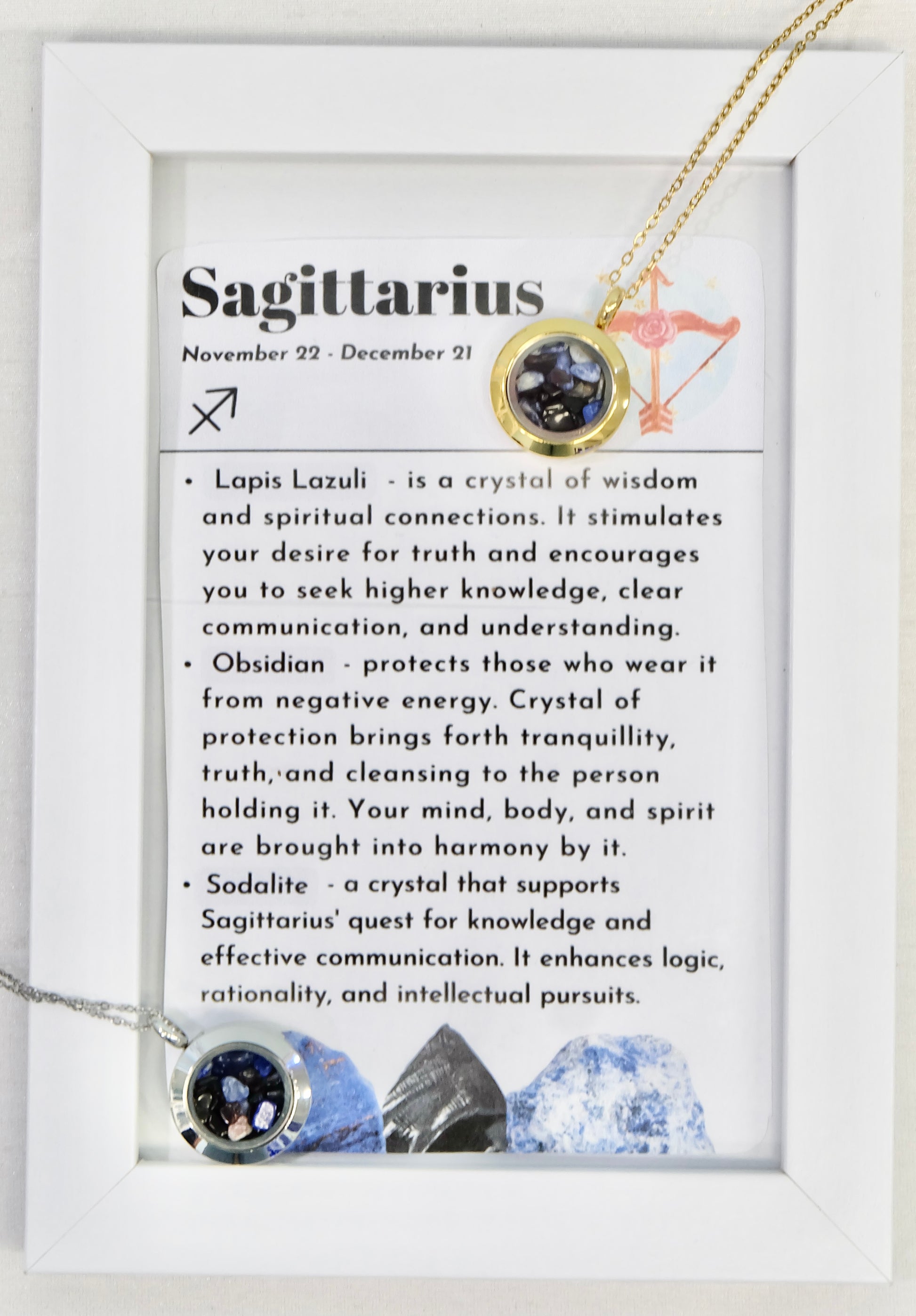 Jeklena verižica s steklenim medaljončkom, napolnjenim s kristali za horoskopski/zodiak znak Strelec