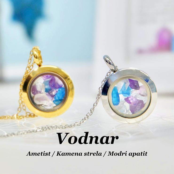 Jeklena verižica s steklenim medaljončkom, napolnjenim s kristali za horoskopski/zodiak znak Vodnar
