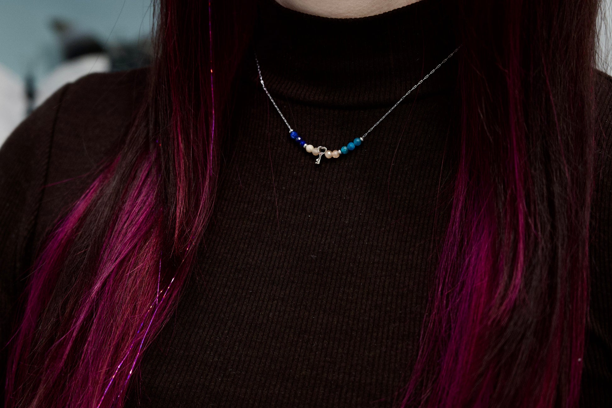 Vsaka ogrlica je izdelana po naročilu, zato se lahko velikost in odtenek uporabljenih kristalov nekoliko razlikujejo, kar pomeni, da je vsak kos resnično unikaten.