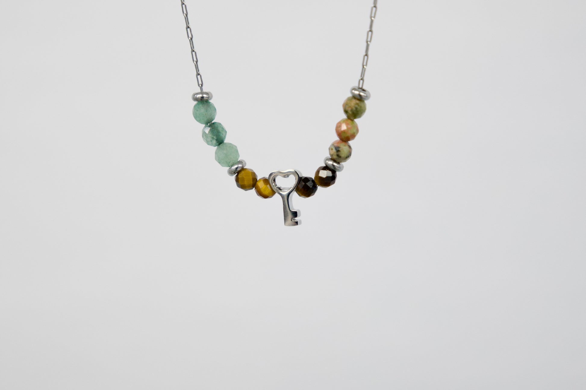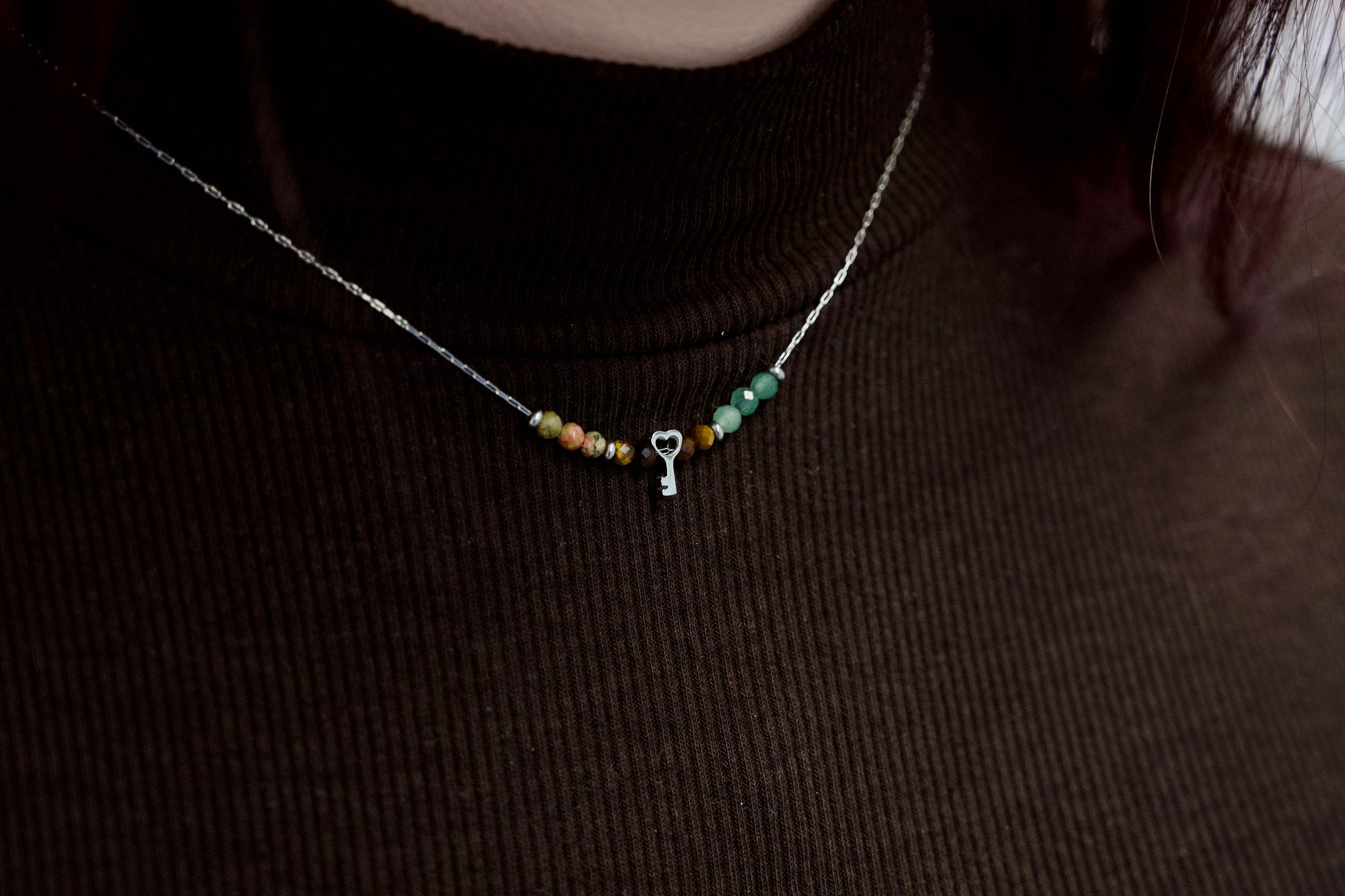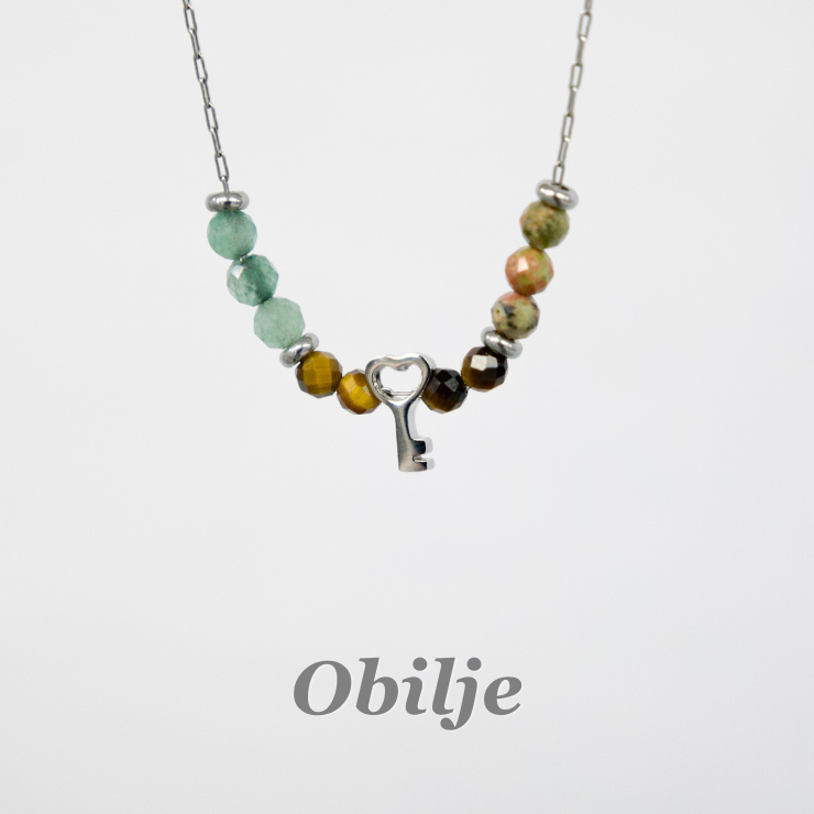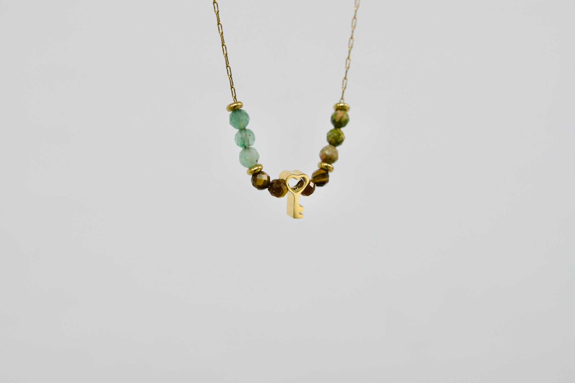 V središču ogrlice visi mini obesek v obliki ključa, ki simbolizira odpiranje novih možnosti, zavestne odločitve in tvojo sposobnost privabljanja obilja v svoje življenje.
