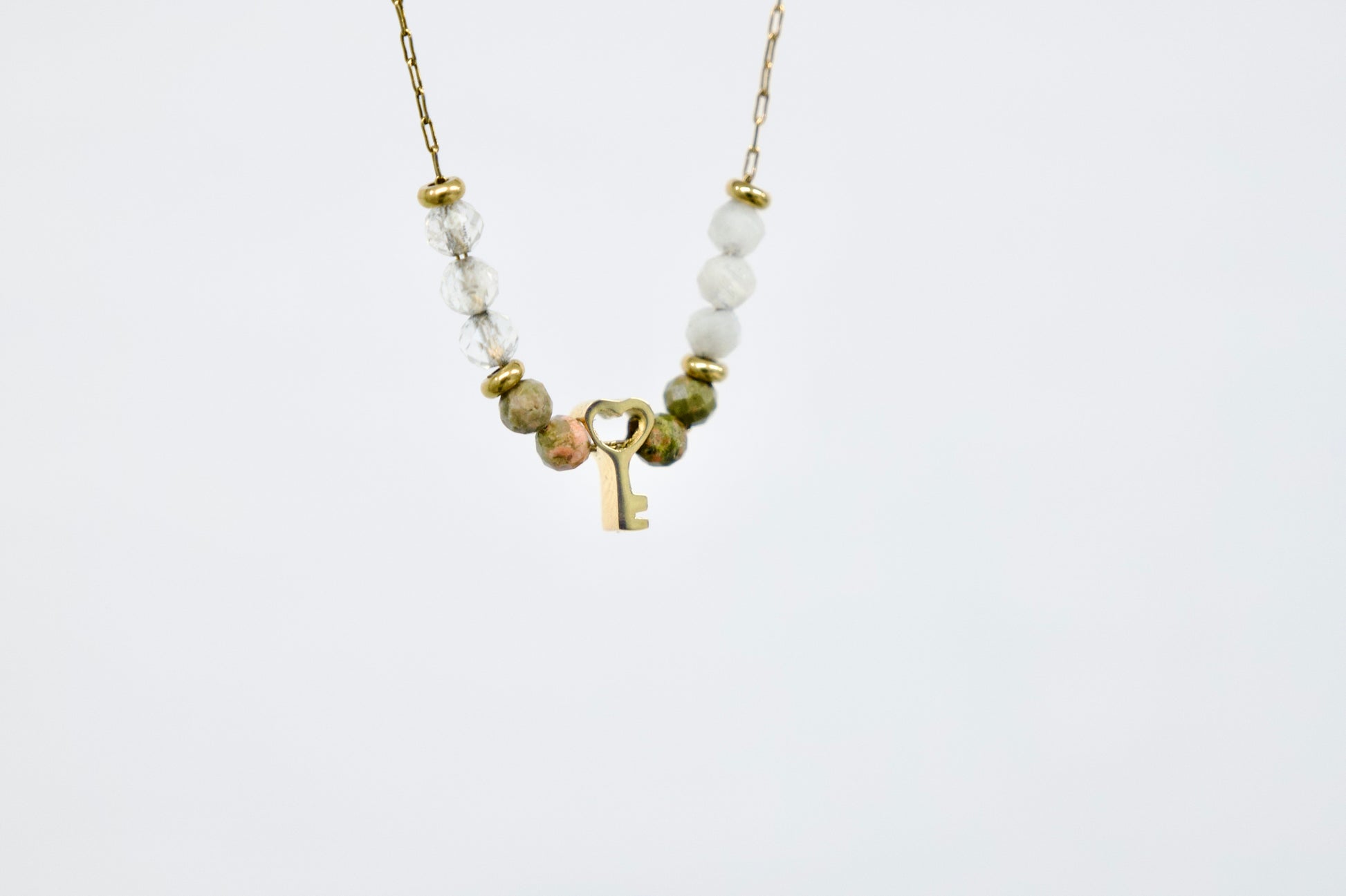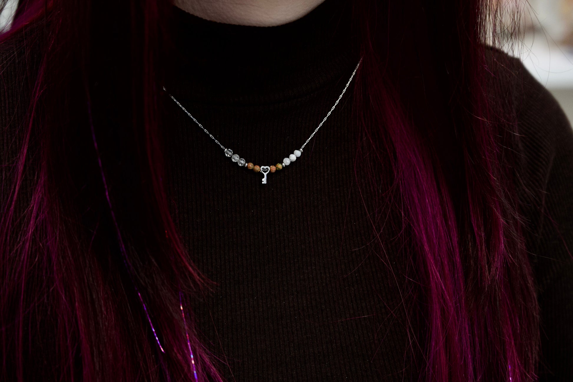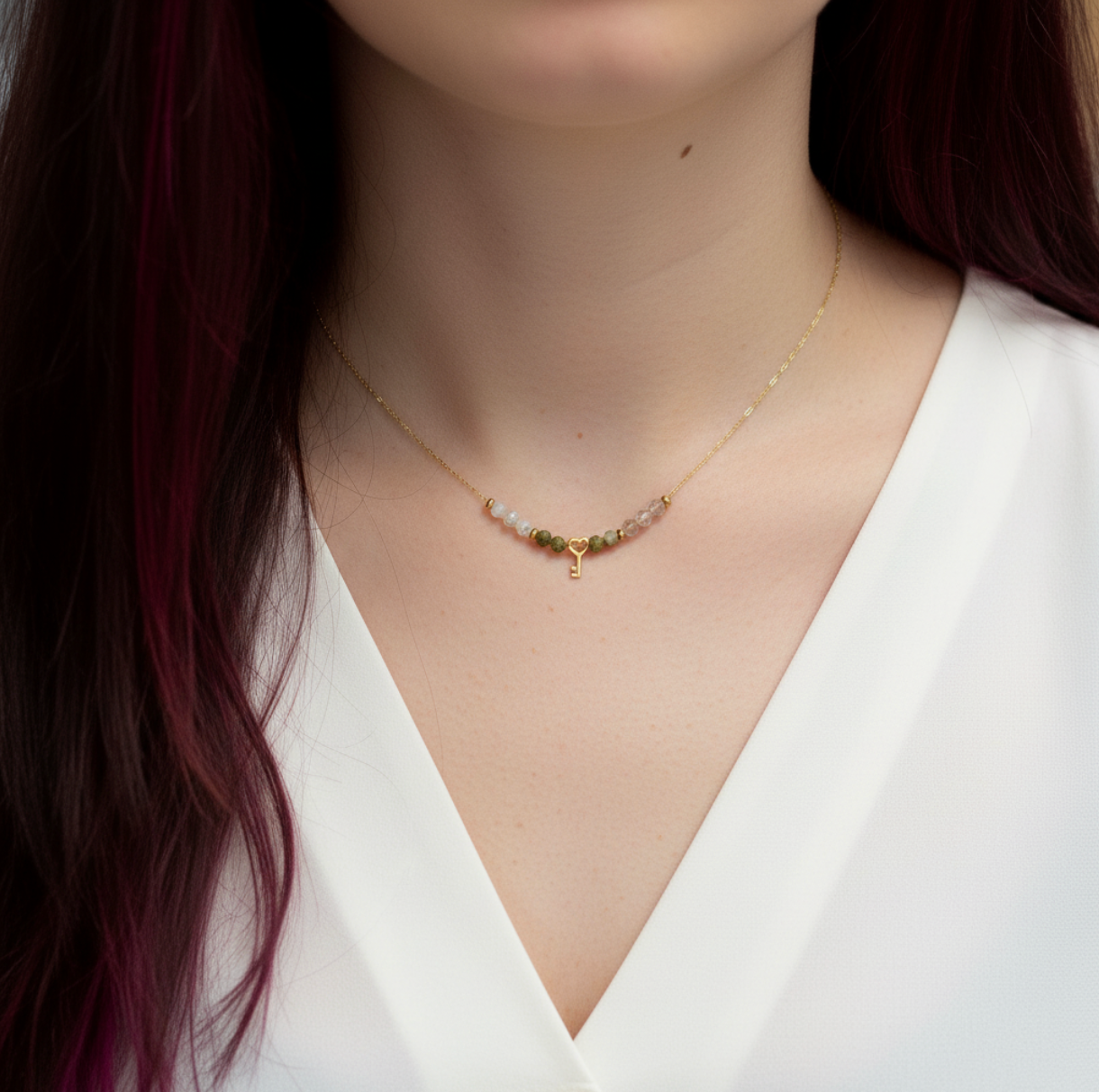 V središču ogrlice visi mini obesek v obliki ključa, ki simbolizira kot simbol zaupanja vase in notranje moči.